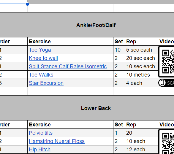 Rebuild and Reclaim: Google sheet with set/reps, videolink and qr code