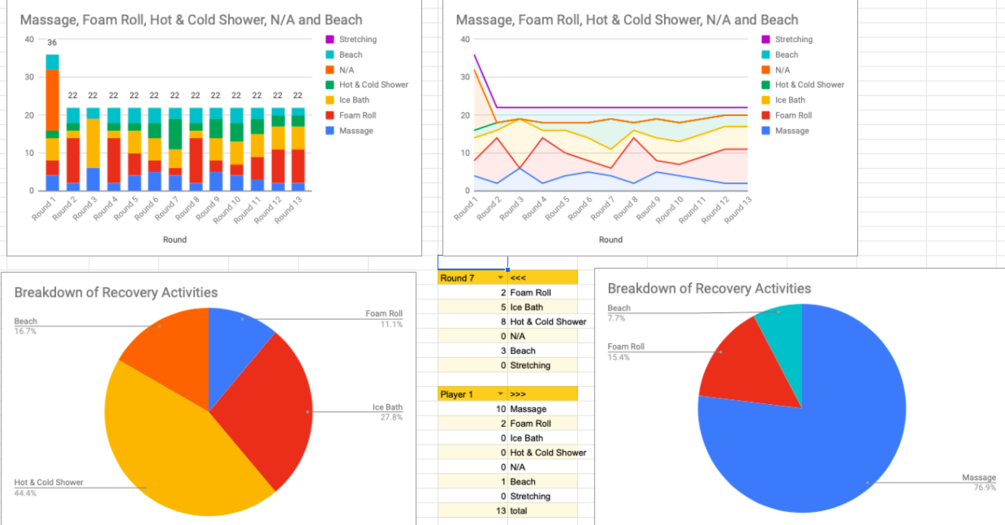 In addition to measuring recovery modalities, our tool can also track the changes over time. This allows coaches the avenue to speak with their athletes about whether the adopted recovery strategies are working and make any necessary adjustments i.e. “How do you feel you prepared/recovered?” or “did you feel ready for performance” through particular periods of time.